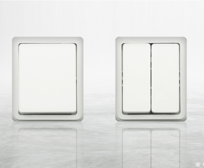 Fichas, tomadas, interruptores, extensões múltiplas, caixas interiores e exteriores, quadros modulares interiores e exteriores, armaduras, etc.